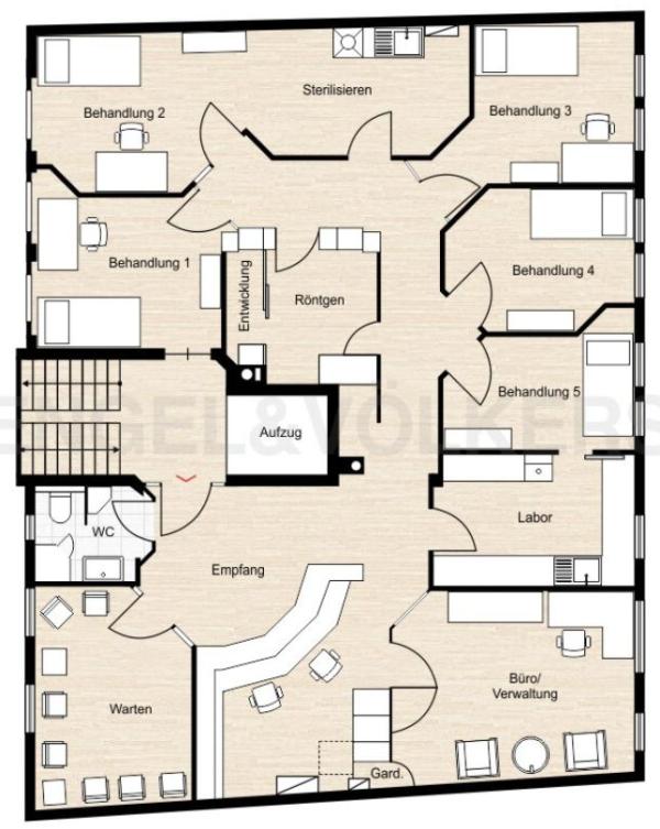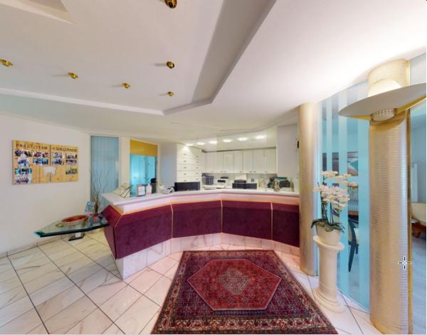 Die Praxis hat 266 m², besteht aus 5 Behandlungszimmern, Sterilisationsraum, Labor, Röntgenraum und Büro.